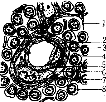 1.上皮性网状细胞突起 2.细胞连接 3.上皮基膜 4.内皮细胞 5.内皮基膜 6.毛细血管周隙 7.巨噬细胞 8.淋巴细胞