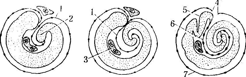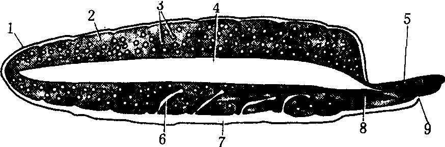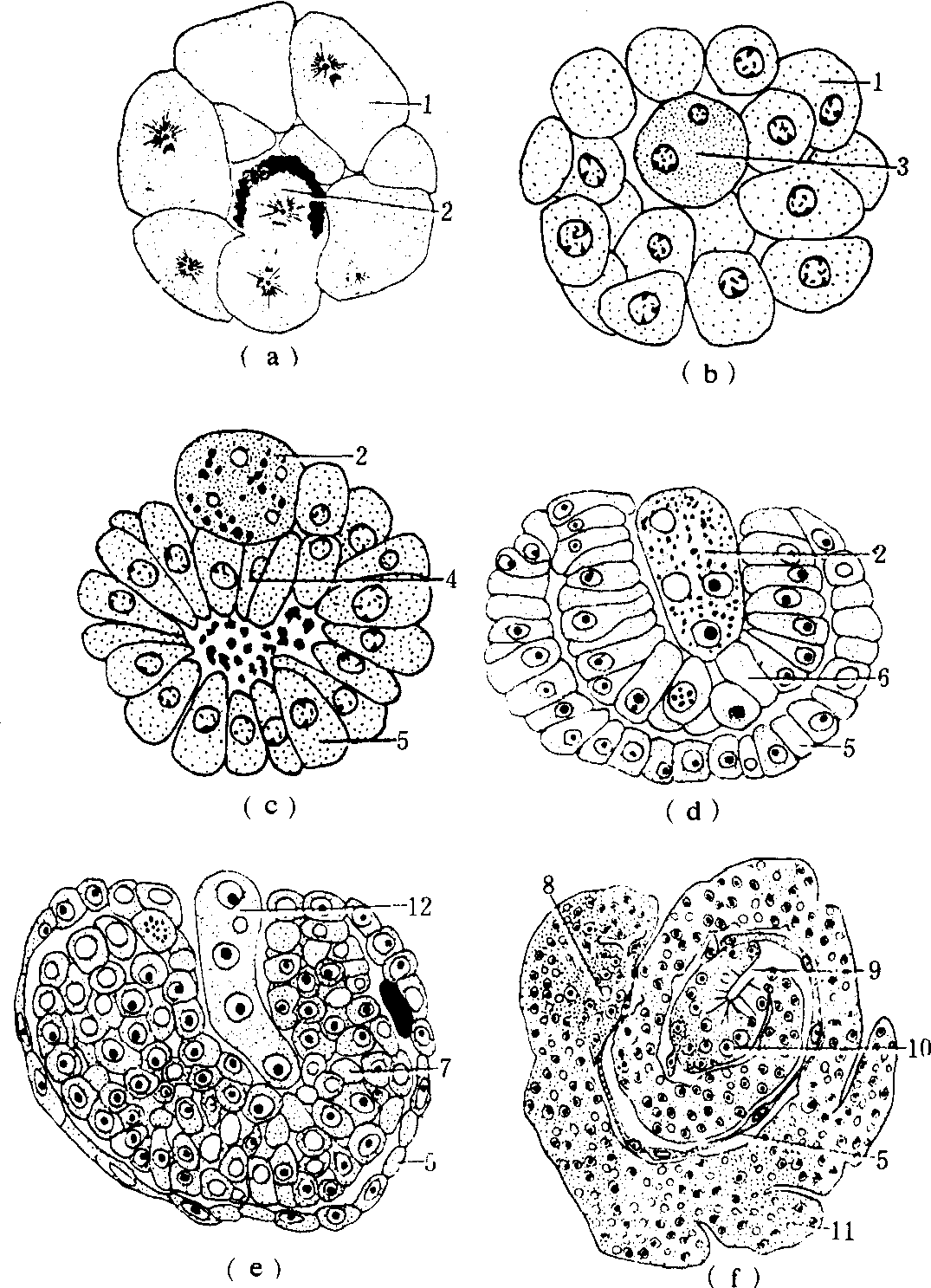 图 2 捻翅虫Stylops的胚胎发育 (a)第五次卵裂后出现卵黄细胞; (b)60个卵裂球的分布图及4个卵黄合胞体(本图示2合胞体核); (c)胚带形成早期(d)胚带形成中期; (e)胚带细胞分裂增殖多层; (f)胚带后期纵切面 1.卵裂球; 2.卵黄细胞; 3.卵黄细胞合胞体; 4.胚带细胞; 5.胚膜; 6.胚带; 7.胚胎; 8.口道; 9.肛道;10.生殖细胞; 11.中足; 12.卵黄 (据H.R.Hagan,J.Noskieasiez and G.Polusynski) 这种胎生昆虫的胚膜发生与变化,与正常卵生昆虫和其他胎生昆虫的很不相同(图2)。胚带与胚膜同时由胚盘分化出来,胚膜围绕着胚带伸长和卷曲,到一定程度之后,头叶的与腹部后段的胚膜相接合,并从接合处破裂,将胚膜分成两部分,连接着头端至尾端的一段胚膜成为覆盖着胚胎背面的背合膜(dorsal clo-sure),其余部分,随着胚胎发育而逐渐消失(图3),胚胎在这个基础上发育成幼虫。