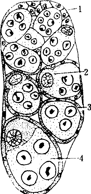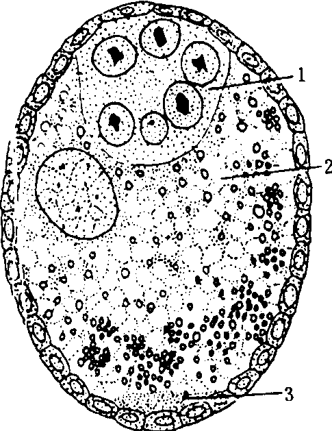 在极质区的卵原细胞,经3次同步分裂,产生8个细胞之后即行停止。随着在卵裂过程中,营养细胞供应大量营养物质,致使营养细胞的体积逐渐缩小而至消失。