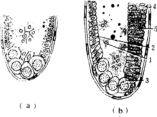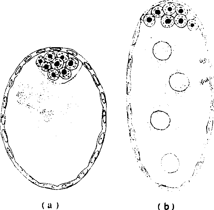 污瘿蚊(Miastor)的繁殖属于幼体生殖方式,卵细胞的形成及胚胎发育,均在母幼虫体腔中进行,由于幼体生殖是属于单性生殖类型,生殖细胞的成熟分裂,没有减数分裂程序,而是以有丝分裂方式进行,产生双倍体染色体的卵母细胞。瘿蚊幼虫具有两个卵巢,在成熟的卵巢内具有一定数量的卵母细胞,每一卵母细胞,陪伴着若干个营养细胞,被包围在由单细胞层构成的囊泡中(图4)。囊壁细胞层来源于母体(幼虫)的中胚层,其结构与一般昆虫卵巢的卵泡细胞层相似,当卵发育成熟后,卵巢破裂将卵释放到母幼虫血腔中,继续发育(图5)。成熟卵无卵壳,在囊泡中进行胚胎发育。卵细胞核位于卵的一边,营养细胞位于囊泡的前端,其后端有极质(pole-plasm)区(图6)。成熟卵细胞经过第一次及第二次卵裂产生4个活质体(energid)时,其中一个进入极质区,形成原生殖细胞(primordial germ-cells);可称卵原细胞(图7),其余3个活质体继续卵裂,形成胚盘。