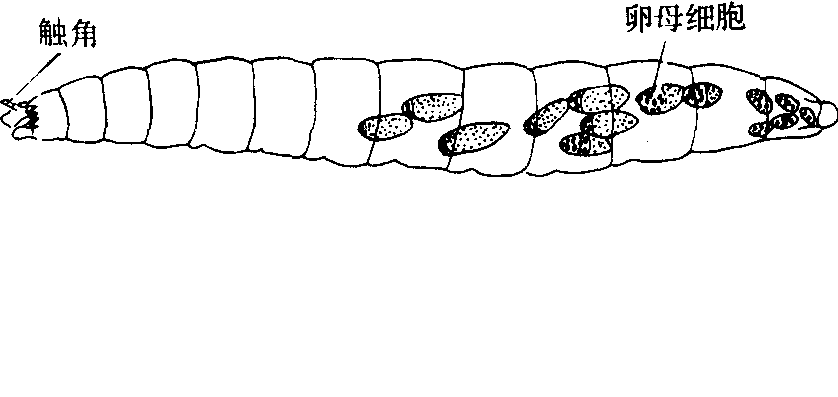 在极质区的卵原细胞分裂的当时,极质区以外的3个活质体,也同样继续卵裂,数量逐渐增加,并向外周移动,终于达到卵周质层,形成排列整齐,厚薄均匀的方形单细胞层的胚盘。位于卵后端的胚盘细胞,由于被胚盘之外的卵原细胞群所挤压,稍向内挤,把胚盘后端的背部及腹部分开,其中的一些胚盘细胞向内移进卵黄区,形成典型的消黄细胞(图8a)。在胚盘后期,位于腹面的胚盘细胞,由方形变为柱形,构成较厚的细胞层,即胚带的原基,称为腹片。腹片前端宽、短,为头叶原基,后端向后伸,围绕着卵母细胞群(图8b)。胚盘背面部分为原来的较薄的胚盘细胞层后端,亦同时迅速向后伸展,绕过卵的后端与腹片细胞层相遇,其后继续以正常典型方式形成胚膜及中胚层即进入胚带期。胚带后端向后极度伸展,到达卵的后端时,即弯向背方,然后转向头端伸展。在卵后端的卵原细胞群亦同时向前移动,到达将接近胚胎头端时,停止前进(图9)。在胚带延伸过程中,出现一定数目的横纹,显示胚体分节开始,随着胚体分节发生过程,胚动开始,胚体逐渐缩短、变直,出现胚胎的腹面部分 (图10)。在此基础上发育成为幼虫。孵化的幼虫,仍留在母体体腔中生活,以母体脂肪体及器官组织为食,继续生长发育,至母体组织消耗殆尽,破母体而出; 进行自由生活,这样幼虫的体内又以同样的发育方式产生下一代幼虫,这类昆虫是一种世代异态交替的,幼体生殖产生若干代以后的成熟幼虫化蛹,变成成虫,产生两性生殖个体,又由两性生殖产生的幼虫,进行幼体生殖而产生后代。