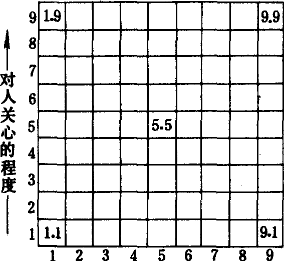 图中1.1型是贫乏型管理; 9.1型是任务式管理;5.5型是中间式管理;1.9型是俱乐部式管理;9.9型是优良协调型管理, 是一种最有效的管理方式。布莱克和莫顿认为,9.9型管理方式表明, 在对生产的关心和对人的关心这两个因素之间, 并没有必然的冲突。企业领导者应该客观地分析企业内外的各种情况, 把自己的管理方式改造成为9.9型管理方式。