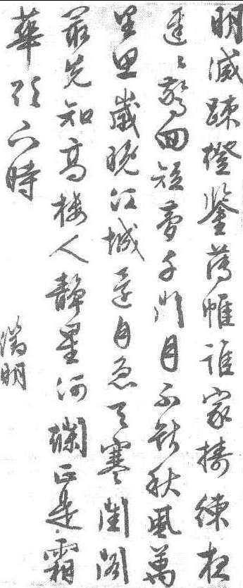 | 释义 | 行书诗轴明代文徵明作。纵129.3厘米,横55.4厘米。纸本。书七律诗一首,连字及款共五行,每行十余字不等,计58字。全文为“明灭疏灯鉴薄帷,谁家𢭏练夜迟迟。惊回短梦千门月,不断秋风万里思。岁晚江城远自急,天寒闺阁最先知。高楼人静星河烂,正是霜华欲下时。”署款“徵明”、钤“衡山”、“文徵明印”二印。其笔势苍劲峻拔,章法清朗洒脱。可谓意到笔随,韵味十足。现藏旅顺博物馆。