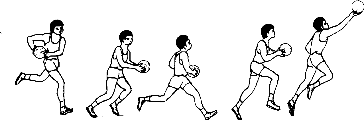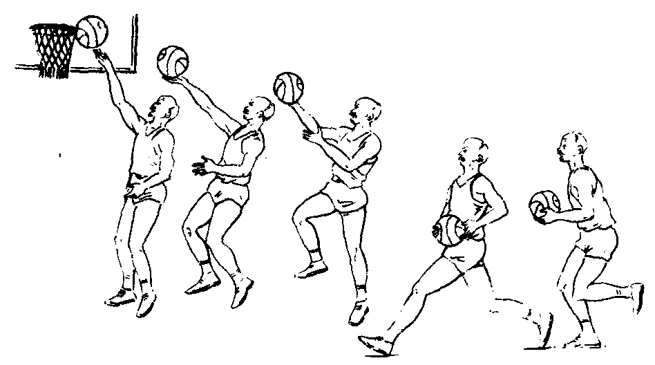 ❷跑动中自抛自接球作行进间单手低手投篮练习, 掌握跑动的节奏、步幅和手脚的协调配合。 ❸跑动中接球作单手低手投篮练习,进一步掌握投篮球出手时腰腹伸展动作和手腕、手指用力的时间。 行进间单手低手投篮跑动中接球或运球后,以手心向上,手指向前持球的方法将球投向球篮的动作,是在快速移动中超越对手后到篮下的一种投篮方法。它具有速度快,手臂伸展距离远的优点,防守队员干扰较困难。当球在空中运行时,右脚向跑动方向跨出一步拿球,左脚接着上步起跳,同时两臂迅速举球,右大腿高抬,配合左脚起跳;腾空后,当身体充分伸展后,左手自然离开球,右手掌托住球,用手腕手指力量向上拨球,使其向前旋转入篮。(见图2—3—94)老年人练习时,根据自己的技术水平可做:原地手心向上的手指拨球练习,体会行进间单手低手投篮的手腕手指用力方法;跑动中自抛自接球的行进间单手低手投篮练习,掌握跑动的节奏、步幅和手脚的协调配合;跑动中接球、运球的单手低手投篮,进一步掌握投篮出手时腰腹的伸展动作和手腕手指用力的时间,但可根据自己的情况,腰腹可伸展,也可不伸展,只要接近球篮时,手腕柔和上摆,食指、中指、无名指向上拨球,碰篮板或空心投篮即可。