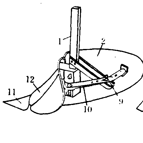 图4 培土器 1、5. 铲柄;2、8. 培土板;3. 垄作铧子;4、12. 分土板;6、10. 调节板;7. 固定销;9. 固定螺栓;11. 铲尖 中耕锄铲的铲柄有的用弹簧扁钢弯曲而成,工作时有缓冲和振动作用,对碎土和灭草均有良好效果。锄铲通常配置成前后两列,两相邻铲间有重叠量,以防止漏锄。锄铲边缘到作物行之间留有护苗带(不耕耘地带),以防止伤苗伤根。 护苗器 防止土块压苗和锄铲伤苗的部件。常见的有滚动式、挡板式和护罩式三种。滚动式护苗器(图5)不易缠草;挡板式护苗器仿形性好,并可越过障碍物;护罩式保护性强。