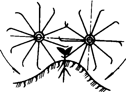 图7 多杆式仿形机构 回转式行间中耕机 具有回转式工作部件的中耕机。主要有以下几种类型: 驱动式旋转中耕机 工作部件由拖拉机动力输出轴驱动旋转。碎土性能好,不易缠草,耕后地表平整。为了防止工作部件抛土掩埋作物,旋转部件两侧加有护罩。 转动锄 是从动式旋转中耕机。工作部件是靠土壤阻力转动的齿盘(见除草机械)。对破碎板结层和坚实土块有较强的作用。 梳齿式苗间除草机 利用两个在横向垂直面内配置的梳齿盘在垄顶两侧相向旋转(图8)。梳齿的最深入土处在垄帮上,具有松土除草的作用。但也存在一定的伤苗率(最多达10%)。