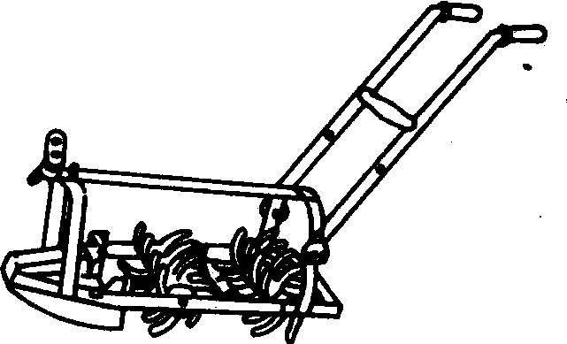 图8 苗间除草梳齿盘的配置 水稻中耕机 在水稻田进行碎土、除草和平田作业的机具。中耕深度约2~6厘米。水稻中耕机按动力可分为: 人力耘禾器 人力操作的水田除草工具,有钉齿式、滚轮式或钉齿与滚轮结合式。图9为蒲辊式人力中耕器,工作时,由框架前装的锄草刀锄草,刀滚将草压入土中。人力中耕器结构简单,除草质量好,但效率低。 畜力水稻中耕机一般由牵引装置、工作部件、机架和扶手等部分组成(图10),由畜力牵引。但因牲畜难于走直线,在作业与转向时常践踏秧苗,故畜力中耕机只在行距宽而直的稻田使用。