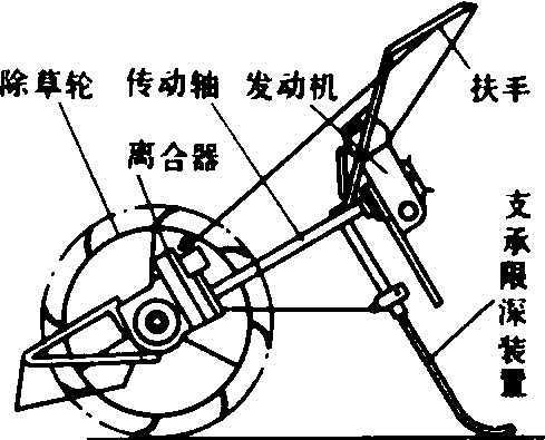 图10 畜力水稻中耕机 动力水稻中耕机 工作部件由工作轮驱动或驱动轮驱动。❶工作轮驱动型(图11)。工作部件是直径为30~40厘米的除草轮,轮上有弧形齿爪。工作时除草轮对地面产生滚压和滑转,其弧形齿搂除杂草,将杂草压入土中并搅动土壤,由土壤对除草轮的阻力推动机器前进。 ❷驱动轮驱动型。驱动轮与工作部件均由动力机驱动。工作部件有小直径爪轮(直径15~25厘米)、钉齿轮和立式旋刀等。这些工作部件对土壤的搅拌能力很强,在多草或板结的田块里中耕效果良好。