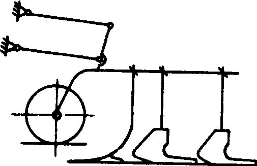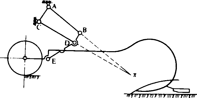 图6 四杆式仿形机构 仿形机构 使工作部件随地面不平而起伏以保证作业深度的机构。常用的型式有:❶单杆式仿形机构。是通过一根拉杆把工作部件与机架铰连。工作部件能随地面起伏而浮动,结构简单。 ❷四杆式仿形机构。由仿形轮和平行四杆机构组成(图6)。仿形轮随地面起伏时,整个中耕单组随之平行地上下运动以保持耕深基本一致。 ❸多杆式仿形机构。其工作部件与仿形轮紧固联结,又与四杆机构ABCD的后支架BD与E点铰接(图7)。该机构有两个自由度,工作部件与仿形轮可绕E点转动,后支架BD还可绕其瞬心π转动。这两个自由度被仿形轮和铲的后踵约束。该机构具有工作稳定、运动平缓等优点,已在中国东北地区垄作中耕机上推广使用。