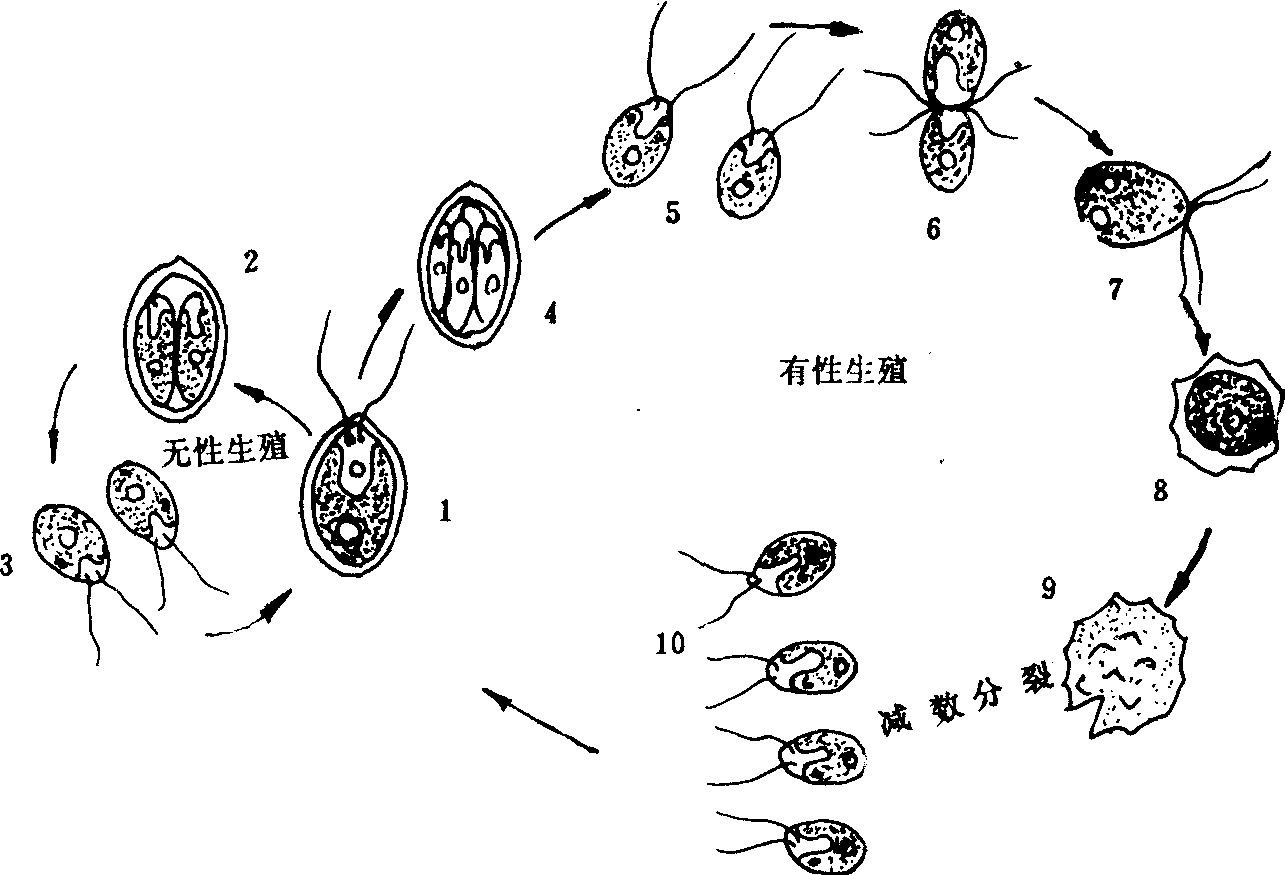 | 释义 | 衣藻yizaoLamydomonas绿藻门、团藻目、衣藻科中的衣藻属。藻体为单细胞,球形、卵形或椭圆形,细胞前端有2条等长的鞭毛,藻体借鞭毛的摆动而游动。细胞质中多具1个大形杯状叶绿体(也有的为“H”形或星芒状,或片状),在叶绿体内靠细胞前部有1个红色眼点,有感光作用。1个细胞核,存在于杯状叶绿体凹入部分的细胞质中。在叶绿体的基部通常有1个大而明显的蛋白核,其表面由聚集的淀粉形成的淀粉鞘。此外,在2条鞭毛的基部通常还有2个伸缩泡。生殖方式有无性和有性生殖两种类型。环境适宜时多连续进行无性生殖。无性生殖时,细胞常静止不动,鞭毛收缩或脱落。其内的原生质体经过1~4次有丝分裂,形成2、4、8或16个子原生质体,随后各自形成1个游动孢子,其结构和母体一样。待母细胞壁胶化破裂时,每个游动孢子即被释放出来,并在水中游动,各自长大成1个新个体。衣藻的有性生殖过程也是首先脱去鞭毛,原生质体经过3~6次分裂,产生8、16、32或64个具2条鞭毛的细胞,叫做配子。其形态结构和游动孢子相同,但更小些。配子释放出来后,成对的进行融合,每对配子产生1个二倍体的合子。合子分泌产生厚壁,经过休眠,当条件适宜时萌发,首先进行减数分裂,各产生4个单倍体的减数孢子。待合子壁破裂后放出,每个减数孢子各形成1个新个体。衣藻的适应性强,各种淡水中都有生长,特别是有机质丰富的小水坑中,常可发现较纯群的衣藻。少数种类可在4℃以下的低温下生长繁殖,如雪衣藻可在积雪上生长。由于其细胞内含有多量的类胡萝卜素,当它们在雪面大量繁殖时,即将雪“染”成绿、黄或橙红等颜色。