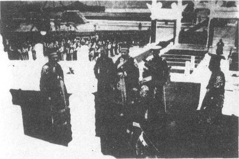 一心复辟帝制的袁世凯在北京天坛祭天 袁世凯1859—1916北洋军阀首领。河南项城人。字慰亭(又作慰庭),号容庵。出身官僚地主家庭。生父袁保中,捐过同知,是横霸乡里的大地主。叔父袁保庆曾任江南盐巡道。袁世凯十七岁时,过继给袁保庆为嗣子。他自幼性格骄矜浮器,狂傲自负,懒于攻读,两次以拔贡参加乡试,均落第而归。他凭借袁保庆同淮军统领吴长庆的友情,于光绪七年(1881年)投靠吴长庆。时“通州才子”张謇正在吴幕,袁拜以为师,学习诗文。后任庆军营务处帮办。次年,朝鲜“壬午兵变”发生,袁随吴入朝鲜,负责前敌营务处。因协助朝鲜国王李熙镇压兵变,清政府奖叙五品同知衔。光绪十年(1884年),得李鸿章奏举,以“总理营务处,会办朝鲜事务”,在朝鲜帮办军务和办理政务。光绪二十一年,以道员衔在天津小站训练“新建陆军”。戊戌变法期间,伪装进步,赞同变法,却向荣禄告密,出卖维新派,取得慈禧太后宠信。二十五年升任山东巡抚,勾结德国侵略者,残酷镇压义和团。二十六年八国联军侵犯北京时,参加刘坤一、张之洞策划的“东南互保”。次年因李鸿章临终时所荐,任直隶总督兼北洋大臣。光绪二十九年为练兵处会办大臣,主持训练新军,后借改革军制扩编北洋军为六镇,成为北洋军阀最高首领。咸丰三十三年调任军机大臣、外务部尚书。宣统元年(1909年)初被摄政王载沣罢职。宣统三年(1911年)辛亥革命时,凭借北洋势力和帝国主义的支持,出任内阁总理大臣。他施展反革命两面派手法,既诱使革命派妥协议和,又挟制清帝退位,窃取中华民国临时大总统职位,在北京建立地主、买办联合专政的北洋军阀政府。民国二年二月(1913年3月)国会召开前夕,指使赵秉钧派人刺杀宋教仁,并在取得“善后大借款”后,发动内战,镇压孙中山领导的讨袁军。后又解散国会,篡改《中华民国临时约法》,卖行专制独裁,鼓吹“尊孔读经”,为复辟制造舆论。民国四年三月二十六日(1915年5月9日),他接受日本提出的企图灭亡中国的《二十一条》。同年十一月(12月)宣布恢复帝制,改次年为洪宪元年,准备即皇帝位。十一月十九日(12月25日)蔡锷等在云南发难,反对帝制,贵州、广西、广东、浙江、湖南等省先后响应。民国五年二月十九日(1916年3月22日),袁被迫宣布取消帝制。五月六日(6月6日)在全国人民的声讨中忧惧而死。 袁世凯1859—1916Yuanshikai北洋军阀首领。字慰亭(又作慰庭),号容庵。1859年9月16日(咸丰九年八月二十日)生于河南的项城县张营村。早年投靠淮军吴长庆,捐同知衔,任驻朝鲜通商大臣。1892年授道员。1894年回国,次年12月被派往天津小站编练“新建陆军”,组成后来北洋军阀的班底。戊戌变法时伪装赞成变法,又向荣禄告密,出卖维新派,取得慈禧太后的宠信。1899年升任山东巡抚,残酷镇压义和团。次年,八国联军侵犯北京,参加刘坤一、张之洞策划的“东南互保”。1901年署理直隶总督、北洋大臣及练兵处会办大臣,以实行“新政”为名扩编北洋军,成为北洋军首领和清朝官吏中最有实力的人物。为削夺其权,1907年明升暗降任其为军机大臣、外务部尚书。1909年被摄政王载沣勒令回家“养病”。1911年武昌起义后,在帝国主义支持下任内阁总理大臣,陈兵长江,一面胁迫孙中山让位,一面强迫清帝退位,窃取中华民国临时大总统职位,在北京建立地主买办专政的北洋军阀政权。1913年派人刺杀革命党人宋教仁。接着从五国银行团取得“善后大借款”充作军费,镇压孙中山领导的“二次革命”。10月派军警胁迫国会选他为正式大总统。后解散国会,撕毁《临时约法》,另行炮制《袁记约法》,实行独裁专制。1915年5月为取得日本支持,复辟帝制,接受了日本企图灭亡中国的“二十一条”。12月12日公然宣布接受帝位,次年改元洪宪元年。袁世凯的倒行逆施,激起全国人民的反抗,1916年3月22日,袁被迫取消帝制,仍称大总统。6月6日,在全国人民的声讨中忧惧而死。