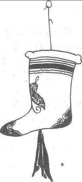 袜子铺幌子,在店铺门前悬挂两只巨型袜子模型,其上绘有花边和蝴蝶图案,下垂一块红布,清代北方汉族特别是妇女常穿此袜。