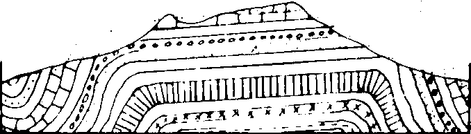 图10 短背斜和短向斜,穹窿和构造盆地 (左为短背斜; 右为穹窿构造; 中下为短向斜。中上为构造盆地) a—g岩层从老到新