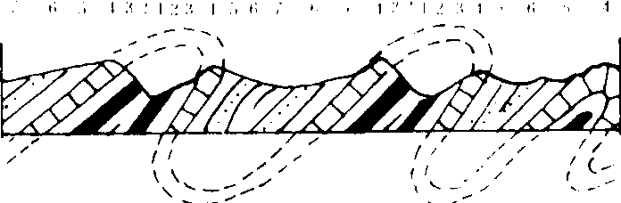 褶皱构造 1,2.微弱褶皱;3, 4,5. 强烈褶皱;6, 7. 等斜褶皱