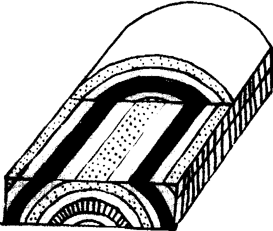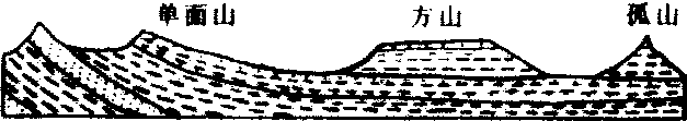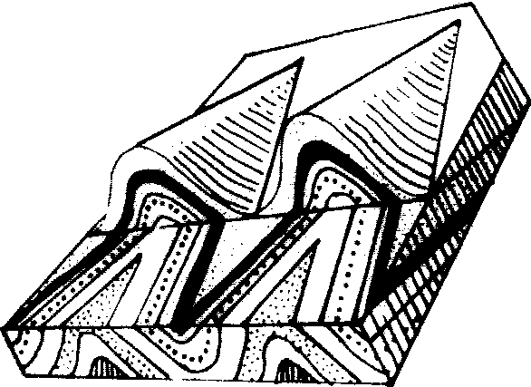 图11 构造盆地剖面示意图 (边缘地层较陡,中心地层较平缓,经过侵蚀可以形成各种地形) 褶皱Zhezhou岩层在构造运动作用下,产生一系列波状弯曲,但未丧失其连续完整性(如图)。它是岩层在地壳运动中所产生的地应力作用下塑性变形的结果,是地壳中广泛发育的地质构造的基本形态之一。褶皱的规模可以是一块手标本,也可以长达几十公里,甚至上百公里。岩层只有一个弯曲称为褶曲,两个或两个以上褶曲的组合称为褶皱(如图)。为了便于对褶曲的描述,对它的各个部分给予命名,称为褶曲要素,如图所示。图中ABGCD包围的内部岩层,即褶曲的中心部分称为核;褶曲两侧的岩层AB、CD,称为翼;褶曲两翼AB与CD的交角,称为顶角;平分顶角的假想面(HIEF)为轴面;褶曲岩层的层面与轴面的交线GE叫枢纽;轴面与水平面的交线FE叫轴;褶曲两翼会合部分BGC称转折端。褶曲有两种基本形式, 即背斜和向斜。向上凸的岩层自轴面向两侧倾斜(或褶曲核部为老岩层,两翼为新岩层)的褶曲称为背斜;向下凹的岩层自两侧向轴面倾斜(或核部为新岩层,两翼为老岩层)的褶曲称为向斜。实际的褶曲形态是很复杂的,根据轴面产状可分为直立、倾斜、倒转、平卧和翻卷等5种褶曲。根据转褶端及两翼特点可分为箱形褶曲、等斜褶曲、扇形褶曲等。根据褶曲的平面投影又可分为水平褶曲、倾伏褶曲、短背斜、短向斜、穹窿构造和构造盆地等。 褶皱变动 褶 皱