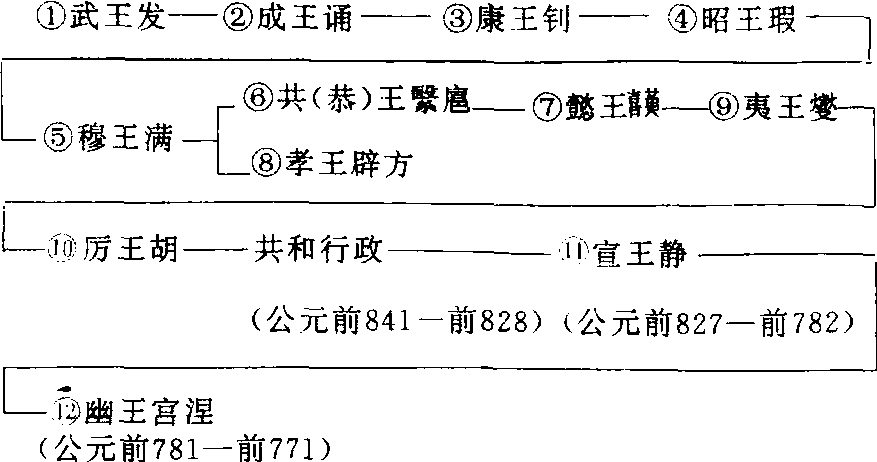 西周朝代名。指周武王至周幽王时期建都于镐京 (今西安) 的周王朝。起讫年代约公元前11世纪至前771年。周武王继位后的第十一年一月癸巳日,周武王率联军伐商,二月甲子日于商郊牧野与商纣王决战。结果 “纣师皆倒兵以战” ( 《史记·周本纪》),纣王逃至鹿台自焚而死。武王以黄钺斩其首,悬于大白之旗示众。次日,宣告 “革殷受天明命”,周王朝建立。两年后武王病逝,由于成王年幼,遂由武王之弟周公摄政。周成王接受周公的辅佐,执政勤谨。周公平定三监之乱和营建成周洛邑以后,还政成王 西周初期,实行大规模的分封以建藩屏,并以商王朝的覆灭为鉴戒,制定各种有利于社会稳定的政策; 为了抑制殷商的奢侈遗风,严令戒酒,如《尚书·酒诰》就是一篇戒酒诰令。直到周康王时,统治者还念念不忘此事。周康王说:“我闻殷坠命,唯殷边侯、田 (甸) 雩殷正百辟,率肄于酒,故丧师已” ( 《大盂鼎》)。成王、康王时期,周王朝继续分封诸侯,开拓疆土,国力强盛。《史记·周本纪》载: “成康之际,天下安宁,刑错四十余年不用。” 即史书誉称的 “成康之治”。从武王开始,经周公东征乃至成康时期,周王朝开拓经营的重点是东方,其次是东南地区。到了昭王时期,凭借强大的国力,便着重向南发展,而对北方的戎族采取守势。昭王虽死于第二次南征途中,但周王朝向南方扩展的目的基本达到。穆王时期,继续向外扩张,史称“穆王欲肆其心,周行天下,将皆必有车辙马迹焉” ( 《左传》昭公十二年)。古本 《竹书纪年》有穆王 “西征,至昆丘,见西王母” 的说法,可见穆王西巡达到很远的地方。穆王以后的共、懿、孝、夷四王在位时期,周王朝已将注意力从对外征讨巡狩转向内部统治结构的巩固,稳定贵族间的等级秩序。继夷王之后的厉王时期,周王朝开始衰微,周厉王虽声称自已 “亡康昼夜,经雍先王”,像先王一样勤于政事,但实际上却弊政丛生。他任用的卿士荣夷公“好专利而不知大难” (《国语·周语》),加重了民众负担,造成“下民胥怨,财力单竭” 的后果。国人暴动之后,“厉王出奔于彘”( 《史记·周本纪》)。共和十四年,厉王死于彘邑,诸侯奉王子靖为周宣王。周宣王初期,曾几次对北方和西北用兵,打败了猃狁和西戎,给周王朝带来几分中兴景象。但随后又连连失败,“中兴” 也化为过眼烟云。前781年,幽王继位,天灾人祸频仍,而幽王荒政,宠幸褒姒,引起朝野上下普遍不满。加上王室与诸侯国之间矛盾尖锐,诸侯干预王朝事务,使矛盾复杂化。前771年,幽王率军与申、缯、西戎等联军战于骊山,大败,幽王和伯服皆被杀于戏,西周王朝至此寿终正寝。在中国古史上,西周是一个重要的王朝,它的政治和经济都有较大发展,以分封制和宗法制为两大柱石的社会结构具有鲜明的时代特征,既与原始氏族时代以及殷商时代的情况有别,又与绵亘两千多年的封建专制时代的情况不同,它继往开来,又自成体系,所以引起了历代史家对它的重视。 西周公元前11世纪—前771年Xizhou朝代名。周是渭水中游黄土高原上的一个古老部落,在商强大时,是商朝的属国。公元前11世纪,周武王趁商王朝阶级矛盾和统治阶级内部矛盾十分尖锐之机,率兵伐商,灭掉商朝,建立周朝。周朝建都镐京(今陕西西安),其疆域东到大海,西到今甘肃一带,北到今辽宁,南到汉江和长江,东南到今江苏。周朝的农业比商朝有了进一步的发展,农产品种类增多,手工业中青铜器的应用比商朝更为普遍。周厉王时残酷的剥削和掠夺引起了各族人民的反抗,公元前841年爆发了国人暴动,厉王出奔于彘(今山西霍县),朝政由诸侯共管,史称“共和行政”。后归政于厉王之子宣王,宣王统治了47年,在这近半个世纪中,阶级矛盾和统治阶级内部的矛盾都更加深化,政权不稳定,到其子幽王即位的第二年,关中发生大地震,人民流离失所,死亡无数,严重的自然灾害加速了周的灭亡。公元前771年,周贵族引入游牧部落犬戎,进攻镐京,杀死幽王,西周遂亡。次年,幽王之子建都洛邑(今河南洛阳),史称东周。西周在经济上推行井田制,这体现了我国奴隶制在西周时代已经获得高度发展,是其繁盛时期。在政治上,西周初年即推行分封制,巩固了奴隶主国家政权,以大大小小的诸侯国来为周王维持奴隶统治。王室的官吏都是由贵族充任,并由其长子历代世袭,保持了以血缘为带联系起来的宗法关系。这种宗法关系是维护以周天子为首的奴隶主统治集团的重要力量。 西周王系表