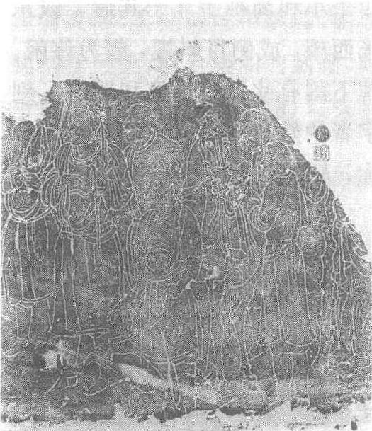 | 释义 | 西域人物石刻线画唐龙朔三年(公元663年)。长36厘米,宽41厘米。立于陕西省西安市西安碑林。此为唐代著名书法家欧阳通所写的《道因法师碑铭》座上的石刻线画。图中数人皆身着长袍,足蹬高靴,卷发髭须,高鼻深目,一望而知是唐代西域人。他们紧跟在一个头戴华冠,手持竹鞭者的后边,或牵犬,或引马,或拄杖,东张西望,脸上露出新奇拘谨的神色,形象颇为生动。人物衣着细处的刻饰起落有致,富于变化,比以往线画人物形象只限于精细的勾划,前进了一步,是唐代线描技艺的珍贵资料。
