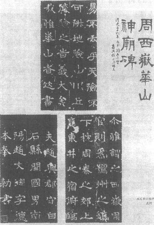 | 释义 | 西岳华山庙碑东汉碑刻。延熹八年(165 )刻。郭香察书、颖川邯郸公佾苏长工刻石。*隶书,22行,行38字。篆额“西岳华山庙碑” 6字。原石明嘉靖地震时毁,今存庙中者为后人钱实甫重刻。现传长垣、华阴、四明、玲珑山馆四种拓本,其中华阴本现藏故宫博物院。清人朱彝尊认为,该碑有“方整、流丽、奇古”三种长处,当为汉隶第一品。 西岳华山庙碑北朝·北周天和二年(公元567年)十月刻。碑高396.2厘米,宽153.2厘米。陕西省华阴县藏。此碑亦称《华岳颂》,由万纽、于瑾撰文,赵文渊书,碑文25行,行55字,额篆书“西岳华山神庙之碑”2行8字。碑阴刻有唐人刘升隶书《华岳精享碑》,左侧有唐人题名,右侧刻有颜真卿正书《谒金天王祠题记》。碑刻有宋人题跋。《华岳碑》是隶、篆书的融合体,时夹有楷书笔意,点画遒丽峭利,结体圆正疏逸,有一种毫无修饰之美感。清杨守敬《学书迩言》云:“北周赵文渊之《华岳庙碑》,如古松怪石,绝不作柔美人之态,亦命世创格,宜其名震一代。”北京故宫博物院藏此碑拓本。明赵崡《石墨镌华》、清杨守敬《学书迩言》、康有为《广艺舟双楫》、日本《书道全集》有著录。