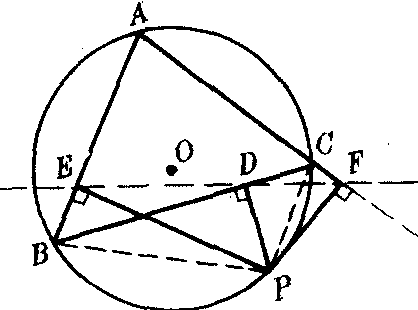 连结ED,FD,CP,BP,由B,P,D,E四点共圆可知 ∠EDB=∠EPB, 同理,∠FDC=∠FPC.又∠FCP=∠EBP(圆内接四边形一个外角等于它的内对角).故∠EPB=∠FPC.所以∠EDB=∠FDC.则E,D,F三点共线.这个证明是西摩松最先给出的,因此把EDF叫做西摩松线. |