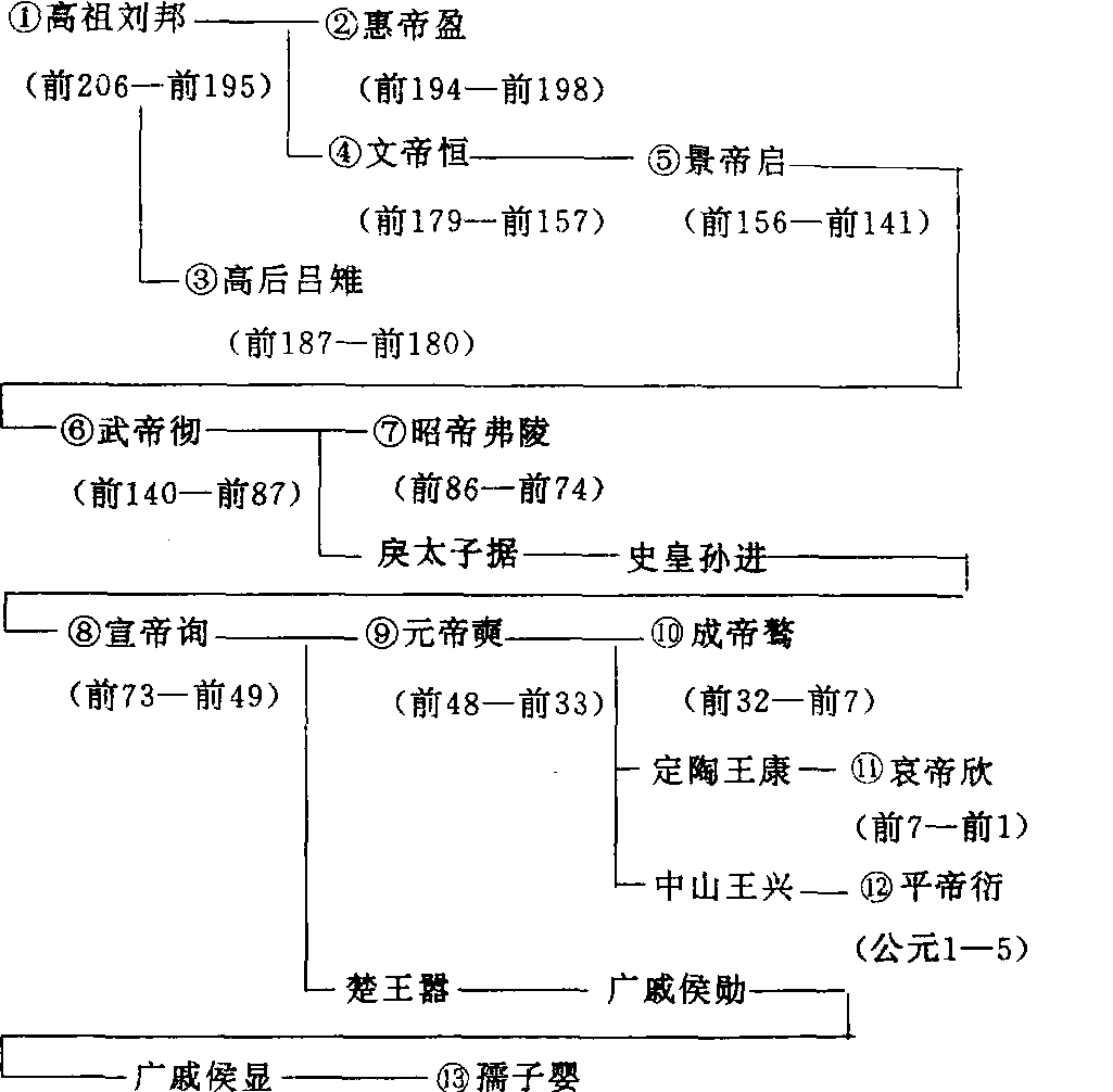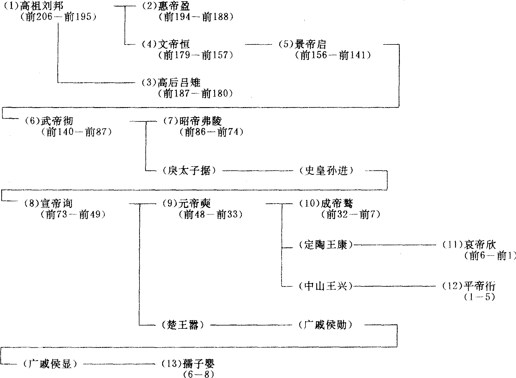 | 释义 | 035 西汉前202—8又称前汉。前202年汉王刘邦打败楚王项羽,称帝,定国号为汉,都长安(今陕西西安)。是当时亚洲最繁荣强盛的多民族帝国。疆域东、南到海、西至巴尔喀什湖、葱岭以西,西南到云南、广西和越南中部,北接大漠,东北到朝鲜半岛北部,历200年,传12帝。公元8年,王莽建立新政权代汉。 西 汉 世 系 表