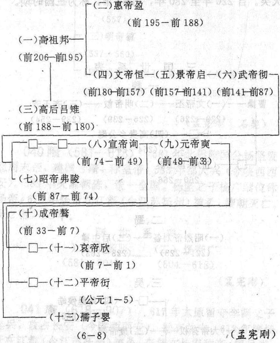 西汉公元前206—公元8Xihan继秦朝而出现的强大的统一封建王朝。前206年刘邦入关灭秦,称汉王。尔后在楚汉战争中打败项羽,于前202年称帝,国号汉,建都长安(今陕西西安),史称西汉。西汉初年,汉高祖刘邦吸取秦亡的教训,实行与民休养生息的政策,注意恢复和发展生产,以医治战乱后凋敝的经济,保证政府的财政收入。经过惠帝、吕后、文景几代的治理,又由于劳动人民的辛勤劳动,社会经济很快得到了恢复和发展。到文景时期,出现了社会安定、经济繁荣富庶的崭新局面,史称“文景之治”。与此同时,西汉政权建立后继承秦制,不断恢复和健全封建国家机器。汉初在推行郡县制的同时,又搞了分封制。刘邦先是封异姓王,后在消灭异姓王的过程中,又封了同姓王。同姓王势力后来发展成地方割据势力。经过景帝平定吴楚七国之乱后,王国势力才有所削弱。到汉武帝统治时期,是西汉王朝的鼎盛时期。汉武帝在政治、经济、军事和思想文化等方面都有所建树。在政治方面,颁布“推恩令”,作“左官之律,设附益之法”(《汉书·诸侯王表序》),大大削弱和打击了诸侯王的割据势力,基本上解除了对中央集权的威胁;建立新的选官制度,用察举、征诏的办法选拔人才;创立州刺史制度,加强中央对地方的监察和控制。在经济方面,注意发展农业生产,兴修水利,推行新的生产技术;改革币制,将铸币权收归中央;实行盐铁官营和均输平准政策;颁布“算缗”、“告缗”令;增加了政府的财政收入。在军事方面,三次大规模出兵打败了匈奴, 解除了对北方安全的威胁, 并多次派人通西域;向南方用兵;奠定了现代中国疆域的初步基础。在思想方面,实行“罢黜百家,独尊儒术”。经董仲舒改造和发展的新儒学成为封建统治思想, 对后世产生极大影响。 西汉帝系表
