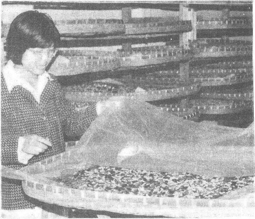 3龄蚕揭膜 湿布育和干布育是将一个空心匾翻身盖在蚕座上,再在其上盖以干布或湿布。湿布视空气干湿程度决定绞剩多少水。湿布育温度降低较多,适于气温高的夏秋蚕期使用。 防干纸育,50年代中后期及60年代初期,在中国广泛应用。它的覆盖材料有两种,一是在整张牛皮纸上涂附石蜡; 一是用聚乙烯塑料薄膜。塑料薄膜需穿小孔,以便适当通气,小孔间距为3厘米左右,孔的大小以蚁蚕钻不出来为度。用防干纸育养蚕时,第1、2龄用涂蜡防干纸或塑料薄膜上下各一张,蚕养其中,四周包折,称全防干 (纸) 育,第3龄只用一张覆盖的,称半防干(纸)育。每日给桑3~4次。眠除后不覆盖。此外,应于给桑半小时前揭去盖纸,进行必要的换气和光线调节,给桑后立即覆盖。 覆盖育covered rearin g即在蚕座上覆盖防干纸或聚乙烯薄膜,以防止水分蒸发,保持蚕座湿润的小蚕饲育方式。防干纸系用牛皮纸涂上石蜡制成,1至2龄在蚕座下面垫防干纸(或塑料薄膜),上下两纸四周重合沿边包折,使之密闭。一般在给桑前半小时揭去覆盖物,加速残桑萎凋,蚕见光爬到蚕座上层,减少伏㯩蚕,同时还有换气作用;眠中不盖,促使蚕座干燥,有利于蚕体健康。夏秋期高温干燥环境下,为保湿降温,有时用湿匾覆盖蚕座,这也是广义的覆盖育。 |