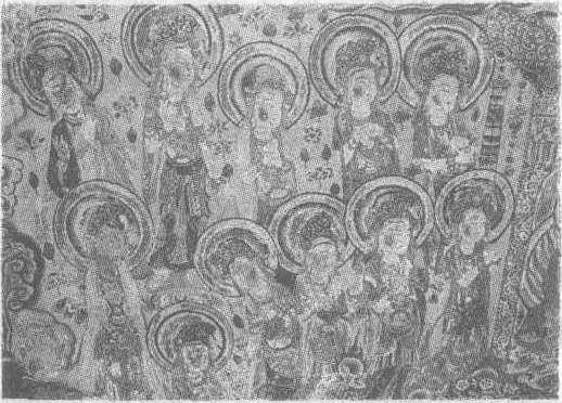 盛唐。纵80厘米,横108厘米。甘肃省敦煌县莫高窟第45窟西壁龛顶南侧壁画。这组菩萨,头戴卷云高冠,面型丰腴,弯眉细目,小口朱唇,体态十分健壮。所披天衣、锦裙装饰华丽,璎珞长垂,越发衬托其肌肤的细腻。菩萨神态安详,面带善意。线描纯熟,色彩艳丽。