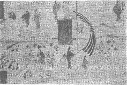 | 释义 | 观音普门品图(海船遇难)壁画盛唐。纵66厘米,横120厘米。甘肃省敦煌县莫高窟第45窟南壁西侧壁画。壁画依《妙法莲华经·观音普门品》而作,着重表现了观世音“广施慈悲”、“法力无边”、“有求必应”的主题。此图描绘一群人入海求宝,遇风后船飘至罗刹鬼国,有人颂观音名号皆得以解脱罗刹难。图中海船一只,帆已升起,桅杆头上系风标,三位船夫以长篙抵肩撑船离岸。船尾一船夫奋力摇橹。几位乘客在船上或立或跪双手合十,想必在念颂观音名号,神态十分虔诚。左侧绘大鲸、大鱼,以表示辽阔的大海。莲花点缀画面,或盛开或含苞,是佛教的象征。此图是唐代航海史的重要资料。