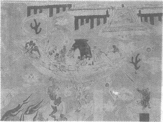 | 释义 | 观音经变图(海船)壁画宋。纵109厘米,横130厘米。甘肃省敦煌县莫高窟第55窟南壁西侧壁画。《法华经·观世音菩萨普门品》中说,一群入海求宝的人突遇黑风,船飘至罗刹鬼国,船上的人念观音名号,得以解脱罗刹难。在碧绿的大海上,一艘带茅庐式船舱的大船正在航行,风帆被狂风肆意吹拂着。几个水手在奋力划桨、撑篙。船上的商人在合掌礼拜。水中有恶鱼、毒龙威胁着他们,同时象征佛法的莲花、摩尼珠也浮现其间。岸上罗刹在欢喜跳跃。整个场面十分紧张,是一幅生动的海上行舟图。绘画技法上还保留了前代风格。