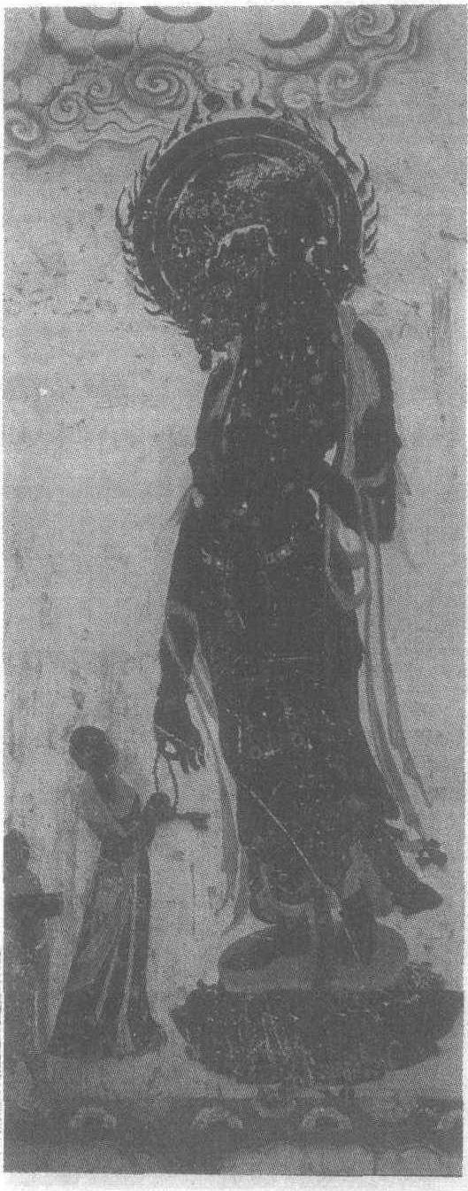 | 释义 | 观音菩萨与供养人图壁画盛唐。纵164厘米,横100厘米。甘肃省敦煌县莫高窟第205窟西壁北侧壁画。观音菩萨脚踏莲花,站姿呈S形,斜低首,比例匀称,体态窈窕。观音两手指捏一串珠,串珠的另一端被供养人所握。供养人立于莲花的一侧,肩披罗巾,身材苗条,抬头仰望菩萨。其身后立一侍从着红色长衫,双手捧供物。此图虽已变色严重,但人物衣饰上的石绿等色仍鲜艳如初,与其它的变色部位结合起来形成别具风格的艺术效果。人物造型都很美,且线条轮廓自然流畅。有人将菩萨与供养人共握的串珠和相互注视的目光称为两者心灵交流的纽带,并称此种设计巧妙地处理了神与人的关系,这种看法是很令人称是的。