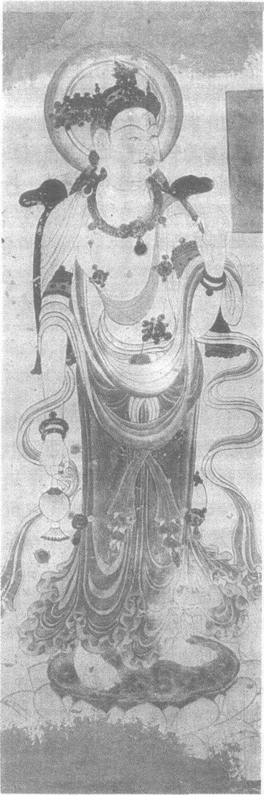 观音菩萨像壁画中唐(吐蕃时代)。纵190厘米,横80厘米。甘肃省安西县榆林窟第25窟南壁东侧壁画。菩萨身体比例匀称,腰肢柔软,其面相则具有男性特征,不仅有蝌蚪胡髭,内在气质也透露出他的沉稳、大度和坚韧不拔的气概。他手提一净瓶,身体各部位所绘的装饰品细致精美,赭红色长裙配绿色飘带柔和雅丽,赭红色石榴裙晕染十分出色,裙子的质感得以体现。此图的线描简洁有力,无论是肌肉的弹性还是衣料的下垂感都通过这些变化多端的线条表现出来。