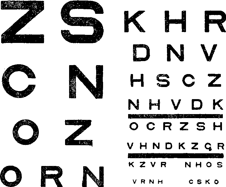 ❷对数视力表。刺激强度以几何级增加,感觉强度以算术级增加,相邻两行视标大小之比恒为1.258926……,即视标每增大1.258926……倍,视力减0.1,增大(1.258926……)2倍,视力减0.2,反之亦同。采用5分记录法:0分=无光感;1分=光感;2分=手动;3分=指数;4分以上可用视力表测得视力,4分=0. 1; 5分表示达到正常视力为1.0。此表系中国缪天荣于1958年创制。分远、近视力表两种。上述视力表对低视力患者均不适用,为此有为低视力患者专门设计的视力表,如灯塔远视力表(图1),低视力远视力表(图2),灯塔图形视力表(图3)等。这些视力表根据低视力患者的特点,设计了各种大视标,分别为200米、175米、150米、125米、100米和75米(国际标准视力表0.1的“E”字视标为50米认清视标)。测试距离可以为5米(规定距离);也可以为2.5米、1米等。如测试距离为2.5米认清200米视标,则该患者视力为5/200×2.5/5=0.0125。对于学龄前或智力低下的儿童,可以用灯塔图形视力表或儿童图形视力表。