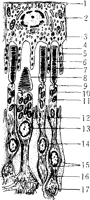 色素上皮及视杆视锥细胞的超微结构 1. 基膜 2. 色素上皮细胞 3.连接复合物 4. 细胞突起 5. 色素颗粒 6. 视杆外节 7. 小盘 8. 视锥外节 9.纤毛 10. 内节 11.线粒体 12.连接复合物 13.视锥细胞 14. 视杆细胞 15. 苗勒细胞 16. 轴突 17. 突触 |