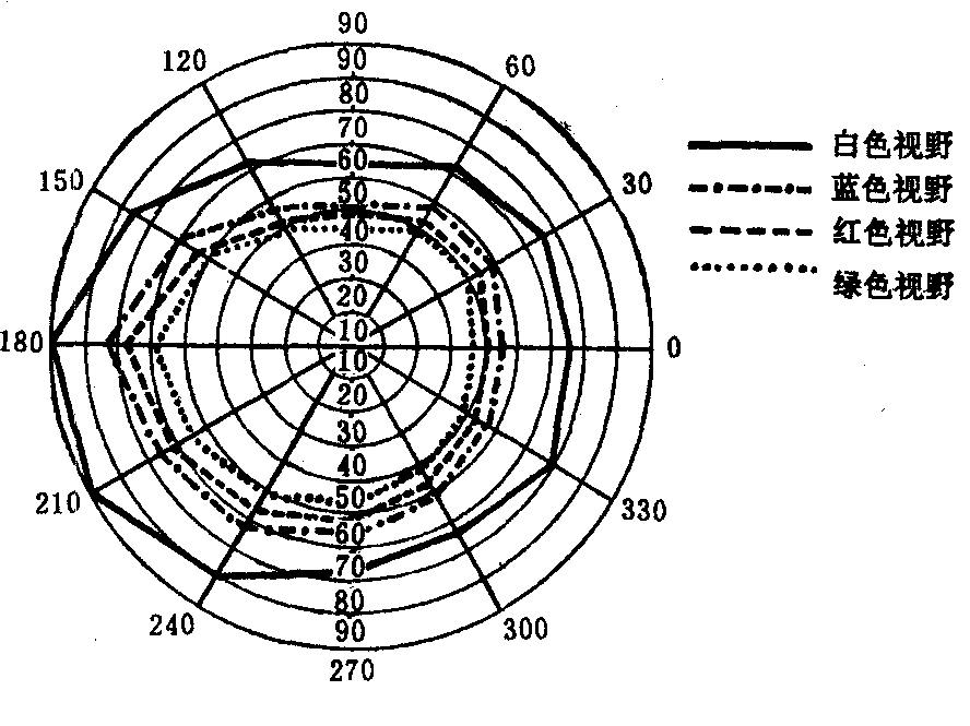 | 释义 | 视野shiye即眼球向正前方注视时,所能看到的空间范围。视野也称周边视力,指黄斑中心凹以外的视力。视野可分为周边视野与中心视野两种。周边视野可用下述两种方法检查:(1)对比法:检查者与被检查者相对而坐,相距0.5~1米,检查右眼时被检查者遮左眼,检查者则遮右眼,用左眼注视被检查者右眼。检查者用手指于各方向作规律性移动,由外向里,用对比的方法了解被检查者有无视野缺损式缩窄。(2)周边视野计检查法:用弧形视野计,相距330毫米,遮盖另眼,被检眼注视中心圆视点,将3毫米白色视标由外向里慢慢移动,询问是否看到视标,或清晰度有无变化,根据弧的角度记录于周边视野纸上。正常人如用3毫米白色视标,距离为330毫米检查周边视野,范围平均上侧为55°,下侧为70°,鼻侧为60°,颞侧为90°。如用各种颜色视标检查,白视野最大,蓝、红、绿色视野依次缩小10°左右。中心视野,用平面视野计检查。检查注视点周围30°范围的视野,这部分相应的视网膜视敏度较高。检查距离为1米,遮盖另眼,被检眼注视中心固视点,选用1~3毫米白色视标,于各方向由周边向中心慢慢移动,记录视标消失或变为不清晰的位置于中心视野纸上。中心视野的固视点颞侧15.5°,水平线下1.5°处有一盲区,其大小为垂直径7.5°±2°,横径5.5°±2°,称生理盲点。这是眼底视乳头在视野计上的投影,因为视乳头上没有视细胞,所以这个区域内任何人都看不到视标。中心视野内除生理盲点外,任何其他盲区都是病理性的。完全看不到视标的盲区,叫绝对暗点;虽能看到视标,但不清晰,或不能明确辨认出颜色的盲区,叫相对暗点,视野检查对眼底病的诊断、鉴别诊断、视路疾病的诊断、病变的定位,以及对了解疾病的进展都有重要意义。