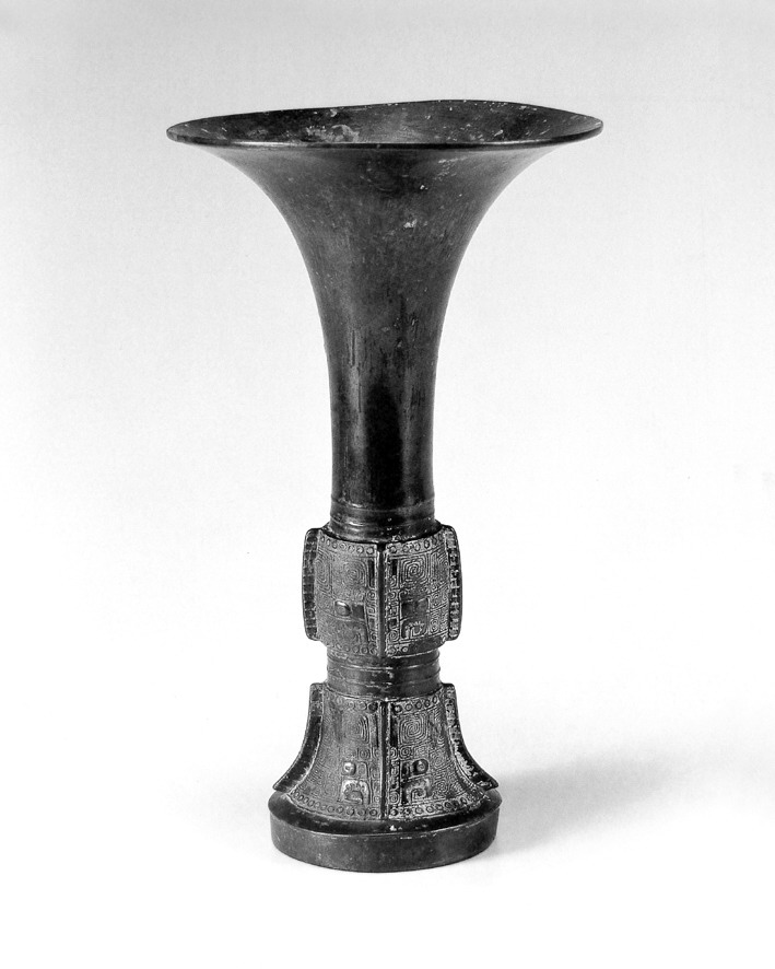 | 释义 | 觚古代饮酒器。亦用作礼器。作饮酒器多与爵配套使用,其口象喇叭,长颈,细腰,圈足。作为礼器,据《论语·雍也》: “觚不觚,觚哉,觚哉。” 何晏 《集解》:“以喻为政不得其道则不成。”所以孔子借觚不其觚来打比方。参见“爵”条。 觚ɡu西周早期铜酒器。1991年泾阳县兴隆乡(今兴隆镇)高家堡戈国墓出土。高28.8厘米,口径16.4厘米。《说文·角部》:“觚,乡饮酒之爵也”。觚与爵是一组最基本的青铜礼器,常伴随出土,也有和斝成组合的。现藏泾阳县博物馆。