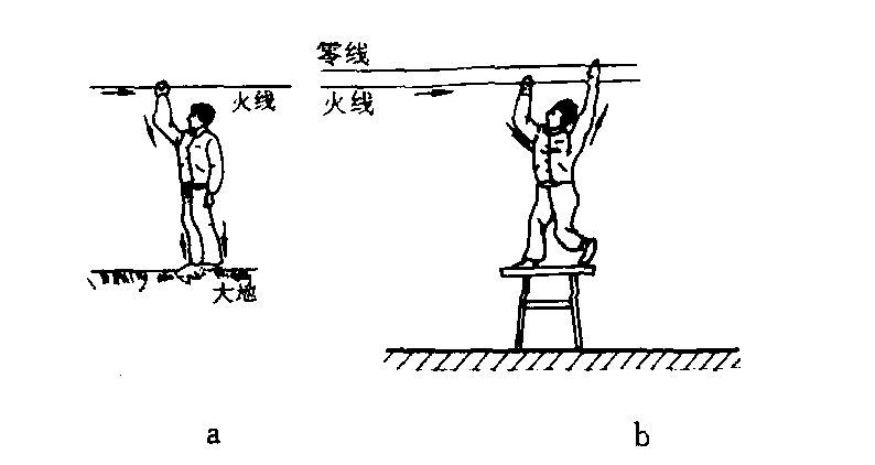 | 释义 | 触电chudian电流通过人体所致损伤。用手误触了电气设备、电线的破损处或用湿手接触电器开关,及在电线上晒衣服等,均有可能发生触电。触电时,电流通过人体,使心脏停止跳动或发生心室纤维性颤动。强大的电流还能作用于中枢神经系统而使呼吸停止。触电后,患者可立即休克,皮肤出现不同程度的灼伤,严重的可当即死亡或几小时后死亡。触电对人体十分危险。一旦发生应立即急救:(1)立即关闭电源开关,或用绝缘物体使患者脱离电源。(2)将患者移至通风处,立即进行人工呼吸和胸外心脏按摩。(3)注意保温,治疗皮肤外伤及骨折等。预防触电要做到:不用湿手接触电器开关和灯头,避免接触漏电的电线;雷雨天气不要在大树下或无避雷针的高大建筑物下避雨; 经常检查维修电器设备。 触电Chudian电流通过人体造成事故的简称。由于人体是导体,当人体与电源构成回路时就会有电流通过人体。电流对人产生的影响,要根据通过人体的电流强弱来确定。经验表明,微弱的电流通过人体时不仅无害,反而有益。如医学上的电疗法,就是让微弱的电流通过病人的身体,刺激某些部位,达到治病的目的。1毫安左右的电流通过人体,人会感觉发麻。电流不超过10毫安时,人自己可以摆脱电源,不致造成事故。当电流在20到25毫安时,会使人感到剧痛,甚至神经麻痹,肌肉剧烈收缩,自己无法摆脱电源,有生命危险,造成触电事故。如果电流达到100毫安,很短时间就会使人呼吸窒息,造成死亡。一般来说,触电电流越大,对人的危害越大。此外,触电对人产生的危害程度还与电流的频率、触电时间及通过人体的途径有关。25—300赫兹的交流电比直流电和高频电流的危害大;触电时间越长,危害越大;电流通过人体的心脏或大脑时危害最大。由于触电电流的大小与触电电压成正比,和人体的电阻成反比,所以触电电压越高,对人的危害就越大。对人体来说,不高于36伏的电压才是安全的(称为安全电压)人体外表皮肤干燥时电阻较大,潮湿时电阻较小,因此当皮肤潮湿时触电电流就较大。触电也可造成严重的电灼伤,这是由于电流的热效应,使人体局部皮肤烧焦,组织死亡。常见的触电事故有两种形式:单线触电和双线触电。单线触电是人体的某一部分碰到了火线,电流从火线经过人体流入大地(图a)。这种情况多数是由于用电器的绝缘不良,造成外壳带电所致。双线触电是人体的一部分碰到火线,另一部分接触零线,使人体被串接在电路中(图b)。发生这种情况时尽管人站在绝缘体上,仍然有很大的电流通过身体,往往造成触电人的死亡。另外还有跨步电压触电。它是由于高压或超高压电线断裂后与地面相碰,使着地点周围出现了以着地点为中心的电位差,当人走入该区域时,因跨步而使两脚所处的电位不同,在人体内部形成电流。离高压电线着地点越近,人的跨步越大,电位差就越大,危害也越严重。为了防止触电,一方面要掌握安全用电知识,另一方面在使用电器时切不可麻痹大意,特别是在安装线路和检修用电设备时,必须严格按照操作规程进行操作,并且采取一些安全措施,例如在电路中接入触电保护器,当人体触电时,保护器将自动切断电源,保护人身安全。