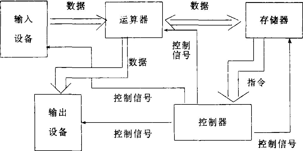 | 释义 | 计算机的结构jisuanji de jiegou计算机一开始是作为一个计算工业出现的,显然,首先要有能代替算盘进行运算的部件,这就称之为运算器;其次要有能起到纸和笔的作用的器件,它能记忆原始题目、原始数据和中间结果, 以及为了使机器能自动进行运算而编制的各种命令。这种器件就称为存储器;再次,要有能代替人的控制作用的控制器, 它能根据事先给定的命令发出各种控制信息, 使整个计算过程能一步步地进行。但是光有这三部分还不够,原始的数据与命令要输入,所以,需要有输入设备;而计算的结果(或中间过程)需要输出,就要有输出设备,这样就构成了一个基本的计算机系统, 如图所示的计算机结构图。