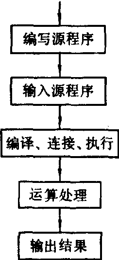 图1 计算机系统层次结构 工作流程 使用计算机系统算题的一般流程(图2), 首先根据要解决的问题,确定算法,编写源程序。然后由输入设备送入源程序,经编译和连接产生机器可执行的目标程序。最后,执行目标程序,将运算处理的结果按用户要求的格式送外部设备输出。