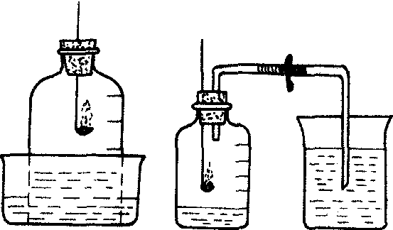 实验中所用的可燃物,必须能在空气中剧烈燃烧,并与氧气反应后生成固体、液体或易溶于水的气体,故采用红磷比较合适。实验装置可用钟罩(见图(1)),也可用集气瓶(见图(2))。 用钟罩做实验时,首先打开钟罩的塞子,然后将它放在水槽中,使钟罩内外的水面高度相等,在钟罩外壁做上水面高度的记号(用线或橡皮筋)。在燃烧匙内铺上少量砂子,并放入足量的红磷(每升空气约需红磷0.22g),以保证空气中氧气全部参加反应。用酒精灯加热燃烧匙使红磷燃烧,立即放入钟罩内,塞紧橡皮塞。红磷在钟罩内继续燃烧,燃烧完毕后,放至室温,可观察到钟罩内的水面上升,上升的体积约占记号以上部分的1/5。实验中必须保证装置的气密性良好,否则会导致实验失败。另外,红磷燃烧时放出大量热,将燃烧匙放入钟罩内若不马上塞紧橡皮塞,其中的气体遇热膨胀,部分气体跑出,会给实验结果带来一定的误差。 用集气瓶做实验时,先在集气瓶内放入少量水,并在瓶外做水面高度的记号。点燃红磷后,立即放入集气瓶中,塞紧橡皮塞,并夹上胶管上的止水夹。燃烧完毕后,放至室温,打开止水夹,水从烧杯中沿导管流入集气瓶中,进入水的体积约占记号以上部分的1/5。 若用酒精、汽油、蜡烛等含碳物质做该实验时,燃烧后的产物中有二氧化碳,它在水中的溶解性不好,且溶解速度较慢,实验结果误差较大。 |