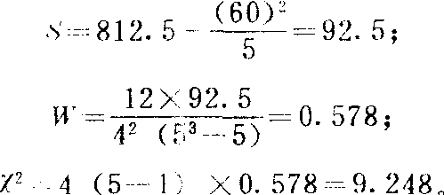 式中 K——评分者的人数 N——考生或试卷数 式中 Ri——秩次和 ——秩次和的平均值W在0~1之间,对W进行显著性检验的公式为: X2=K(N-1)W 它服从于自由度为N-1的X2分布。但在大规模的筛选性考试中要求W在0.9以上。 [例] 4个评分者对5篇高考作文的评分结果如下,求评分信度。
