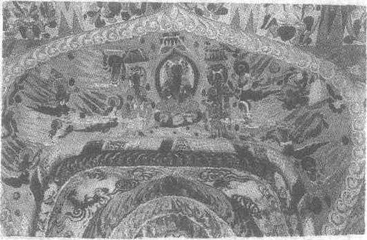 | 释义 | 说法龛楣壁画北周。甘肃省敦煌县莫高窟西千佛洞七窟中心柱南龛壁画。此龛楣颇具特色,画的是说法图,释迦牟尼居中结跏趺坐,神情庄严。左右各侍立菩萨一尊,体态修长,衣饰潇洒,佛与菩萨头顶皆有华盖。两侧是供养飞天和伎乐飞天。伎乐飞天在弹拨、演奏乐器,供养飞天手持盒、盘等物,造型刚柔并济,构图疏密有致,严谨与活泼结合得当,设色浓艳,十分醒目。