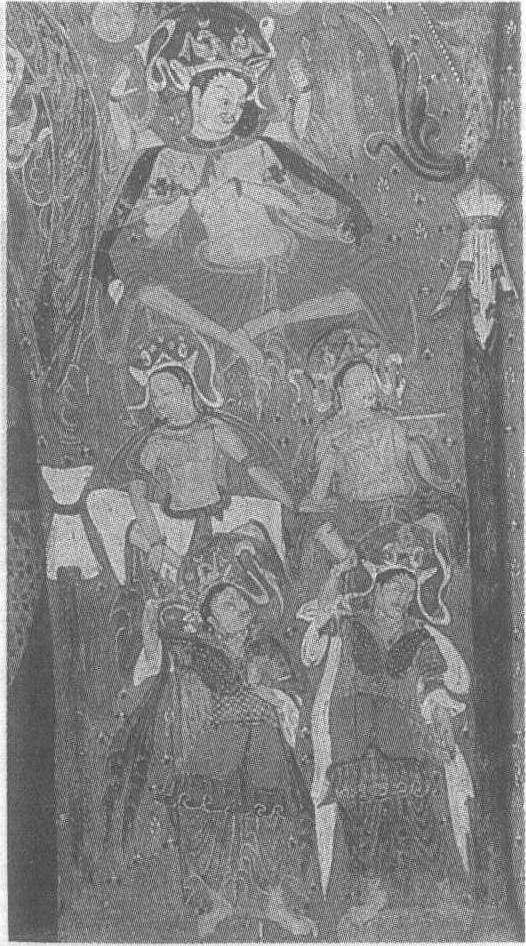 | 释义 | 诸天图壁画西魏。纵180厘米,横110厘米,甘肃省敦煌县莫高窟第285窟西壁主龛南侧壁画。图中上为毗瑟纽天(又名那罗延天),三头六臂,手障日月,持贝、轮等各种法器。上身赤裸,衣带飞舞,腰系过膝裙,深浅两种线条相间,褐缘,十分素雅。中为二力士,穿着与毗瑟纽天类似。再下为二天王,头戴宝冠,铠甲披身,手持兵器,一幅战将的姿态。