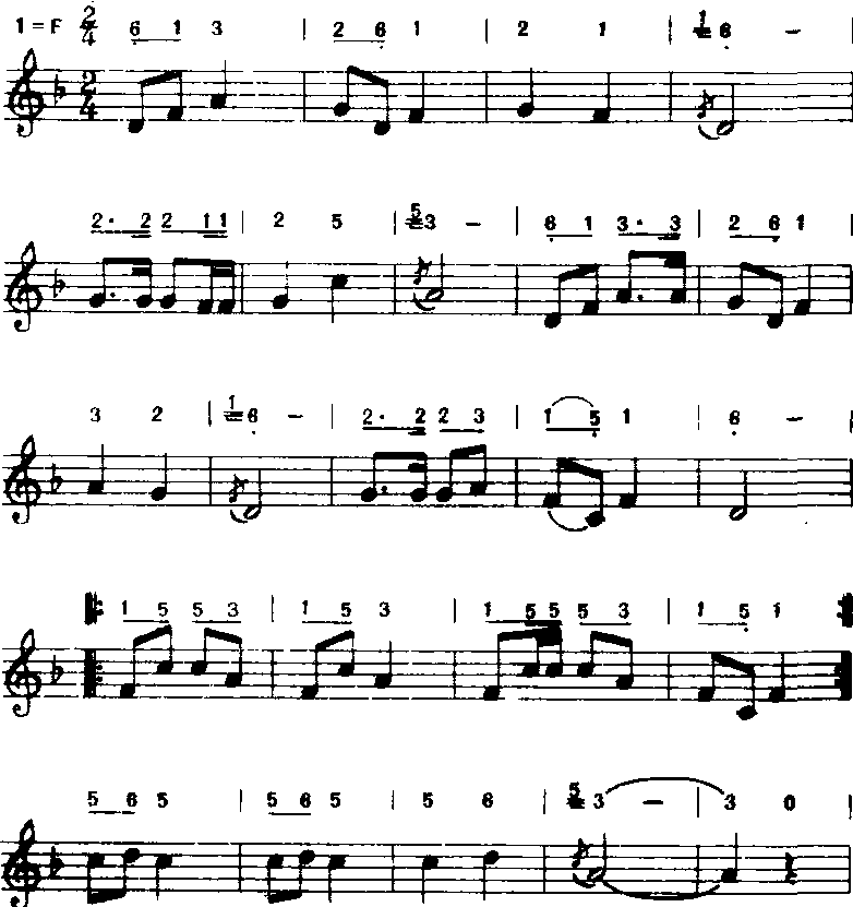 以上歌曲的A段是以D为主音的五声羽调式,B段是以F为主音的五声宫调式既换了调式,又换了主音(同宫系统的调式转换)。调式、调性对比手法的运用一定要根据歌词内容的需要和感情色彩的变换而定,才能达到预期要产生的对比效果。 |