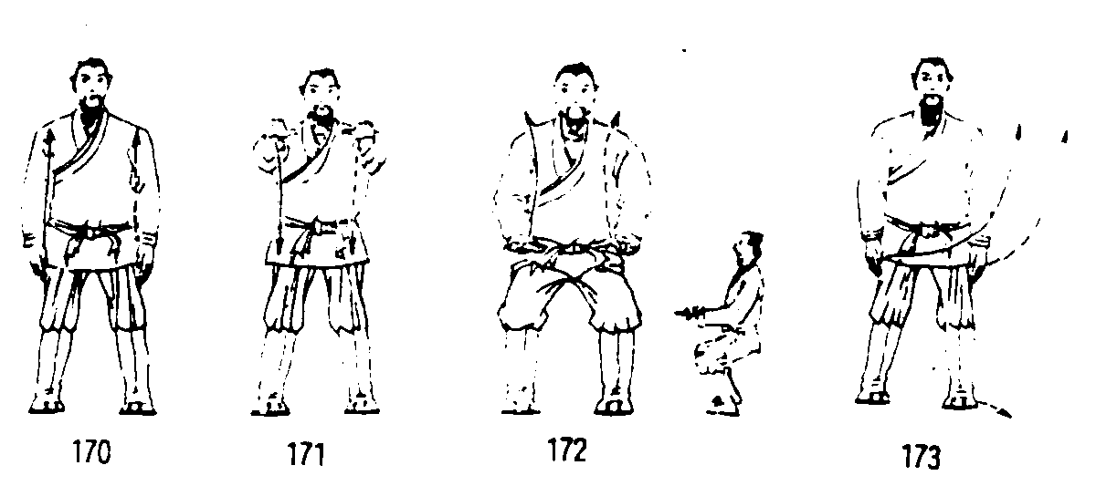 导引保健功动作之一。8拍动作:预备势:两脚开立与肩同宽,脚尖朝前,两掌垂于体侧;眼平视前方。(图170)❶随着吸气,提肛调裆;同时两掌徐缓向前、向上摆起,高与肩平,宽与肩同,掌心朝下,两臂自然伸直;眼平视前方。(图171)❷随着呼气,松腹松肛;同时两腿屈膝半蹲,两掌轻轻下按至腹前,掌心朝下,掌指朝前,两肘尖下垂;眼平视前方。(图172)❸❺❼拍同❶拍,❹❻❽拍同❷拍。练功次数:做两个8拍。第2个8拍的第❽拍两腿伸直,两掌垂于体侧;眼平视前方。(图173)要点:两掌向前、向上摆起时要沉肩垂肘,切勿挺胸挺腹;两腿下蹲时要松腰敛臀,两肘要下沉稍回收;气沉丹田。