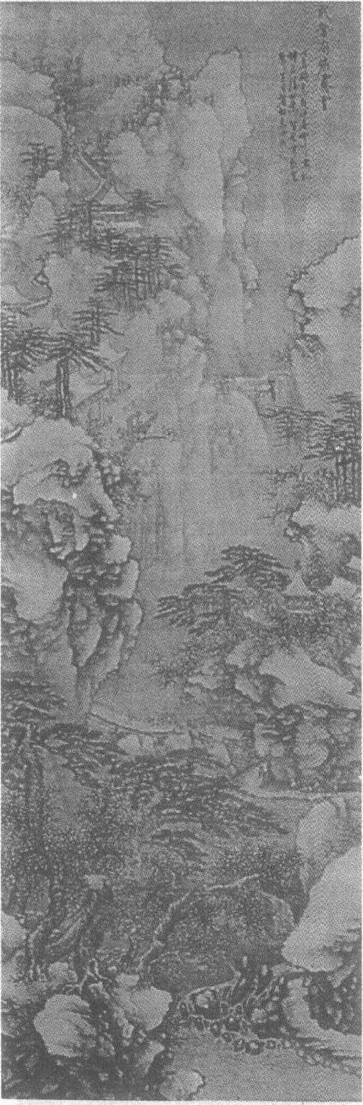 | 释义 | 谢时臣武当南岩霁雪图轴明。谢时臣(见《谢时臣虎阜春晴图轴》条目)绘。绢本设色。纵296厘米,横100厘米。山东省青岛市博物馆藏。此图绘武当山南岩雪后的景色。岗岭重叠,松木挺立茂密。近处泉流潺潺,右下一条小路沿山直通上方山岭。左、右绘挺拨峭立的山峰,树木环抱着亭台楼阁。赏景的游人在亭间游玩、戏耍。两山之间留有空隙,以示幽谷的森奥和深不可测,显出了山势的高峻峭拔。两桥飞卧,把两山连接起来。栈道上,游骑行旅不断,都是趁雪后初晴进山观赏雪景的人们,极尽生活之情趣。此图设色雅丽清爽。峰峦山石、树木屋顶以及远山皆留白,天空淡墨烘染,显得大雪很厚,寒气逼人,一片白茫茫的景象。白雪绿松,名山胜迹,更显山河的壮美。笔墨严谨,构图巧妙,气势雄伟。右上自题:“武当南岩霁雪。”此图是谢时臣大章法的山水画,作于明嘉靖三十一年(公元1552年)。