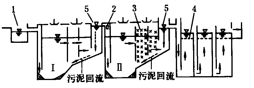 图2 分流式污水净化装置剖面示意 1.粪便污水沉砂池;2.其他生活污水入口;3.软填料;4.过滤泡沫板;5.水压间 此工艺流程设有两个前处理池,池Ⅰ专门处理粪便污水,达到清浊分流。为延长粪便滞溜期,经水压间排出的清液流入池Ⅱ,其他生活污水直接流入池Ⅱ。因池Ⅱ的污水量大,故内装有醛化维纶纤维制成的软性填料,作为微生物的载体,表面积一般大于3000平方米/立方米。池Ⅰ的结构呈较深的“斗”状,水压间中安装有聚氨酯过滤泡沫板。该泡沫板的孔径为200微米左右,能使悬浮固体不溢出,沉降下的污泥可回流至“斗”中,以增加微生物数量,有利厌氧发酵,也使污水与污泥分离。后处理池为折流式污泥床,分为3~4格,每格中亦安有过滤泡沫板。污水从水向上流动,不会产生淤塞现象。后处理池与大气相通,其作用是进一步净化来自前处理池的污水。生活污水可依靠各段水位高程自动向指定方向流出,不耗能源。在有地势可利用的场所,可将后处理池的一部分容积设计成好氧滴滤池。当流出的水体对氮、磷有特殊要求时,可增设生物氧化塘,塘中种植耐肥水生植物(如水风信子等)。后处理池还可增添消毒设备,作为疾病流行时季节性消毒之用。 中小型生活污水净化装置适用于小城镇企事业单位、居民点、住宅、办公楼、旅馆、道旁和公共娱乐场所的公共厕所等。 池容积计算 可按不同建筑物的使用特点和污水滞留期决定。污水滞留期通常取为3天。一般可直接按标准化粪的公式计算总容积。也可按下列简化公式进行计算: V=KN 或 V=KD 式中 V为小型生活污水净化沼气池总容积(立方米);N为实际使用人数;D为公共厕所蹲位数;K为有效容积基数,由下表给出:
