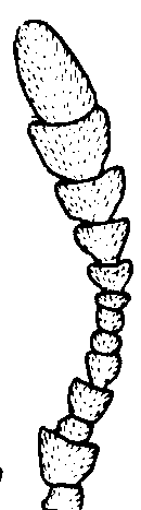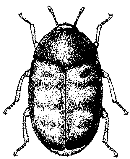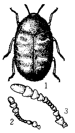 谷斑皮蠹 1. 成虫 2. 雄虫触角 3. 雌虫触角 |