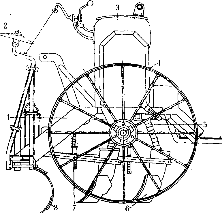 谷物条播机示意图 1.机架;2.划印器;3.种箱;4.地轮;5.输种管;6.开沟器;7.播深调节板;8.松土铲 机架 多为组合式矩形框架。用于支承或固定工作部件和辅助机构,并传递牵引力。牵引式条播机的机架前面装有三角形牵引架;悬挂式条播机上装有三点悬挂架。 地轮 位于机架两侧,用于支持机重及作为行走轮和播种机工作部件的驱动轮。在工作或运输状态都必须保持播种机稳定,振动小;能适应地形起伏;滚动阻力小;有足够的附着力,滑移小,传动可靠等。条播机地轮有铁轮和橡胶轮两种。谷物条播机大多采用的是刚度较好、具有抗侧移能力的凹槽形断面的铁轮,其直径和轮缘宽度应根据负荷大小、土壤条件等确定。采用橡胶轮作为条播机地轮呈日增趋势,它具有滚动阻力小,下陷小,滑移小的优点;还可减轻条播机振动和冲击,使工作稳定;适合于高速作业和运输。 种子箱 多采用薄钢板制成的整体结构,通过支撑杆固定在机架上方,底部安装排种器。种子箱一般要求: ❶有足够的容量,以减少加种次数或便于田头加种; ❷其结构应保证种子能顺利流入排种器,且便于加种、卸种和清种; ❸坚固耐用,耐腐蚀,箱盖关闭严密以防止雨水浸入。种箱的容量由播种行距、播种量、地块长度来确定,在某些兼施种肥的谷物条播机上,种箱与肥箱组成一整体,用隔板相隔,可通过改变隔板安装位置,来改变种子箱和肥箱容积的比例。 排种器 见条播排种器。 输种管 安装在排种器和开沟器之间,将排种器排出的种子导入开沟器,使种子能顺利落到种沟内。因此,输种管应有足够的断面积,内管壁应光滑,使种子畅通;有弹性,可伸缩,能弯曲,以适应开沟器的升降和调节。输种管的类型较多,适用于谷物条播机的主要有金属卷片管、波纹塑料管、橡胶褶皱管等。 开沟器及其升降机构 见开沟器。牵引式条播机上设置开沟器升降机构,其升降高度要满足播深调节范围及运输间隙的要求,而且调节播深准确方便。升降机构主要有三种型式: ❶手杆式,大多用于畜力条播机; ❷机械自动式,主要用于牵引式机力条播机,地轮通过自动离合器驱动四杆机构,使开沟器升起或降落; ❸液压自动式,在现代大型牵引式条播机上采用,以液压缸操纵和升降开沟器。 在开沟器升起,即从工作位置变到运输位置时,离合器切断传动,使排种(肥)器停止工作。反之,开沟器下落到工作位置时,离合器接合传动,排种(肥)器重新开始工作。 覆土器 种子落入种沟后,为达到要求的覆盖深度,必须安装覆土器。谷物条播机上常用的覆土器有拖环式、拖杆式和弹簧钢丝式。 划印器 见划印器。 传动机构 谷物条播机上的排种器和排肥器,大多由地轮通过传动机构驱动。为使排量均匀、稳定,传动机构必须工作可靠,调节方便。传动机构常用链传动,齿轮传动加上适当的变速机构。谷物条播机上可采用左右地轮各驱动半数排种器和排肥器。或一个地轮驱动全部排种器,而另一个地轮驱动全部排肥器。亦可用镇压轮通过链传动驱动排种器和排肥器。 谷物条播机grain drill主要用于播种谷类作物的条播机。有人力、畜力和机力等多种机型。其主要工作部件有梯形断面的一体式种子箱、小外槽轮式排种器、卷片式输种管、双圆盘开沟器、链环式或拖板式覆土器;辅助部件有机架、行走轮、传动装置、开沟器起落机构和深浅调节机构等。谷物条播机最适用于条播麦类作物,经过适当调整,可以条播豌豆、高粱、玉米、大豆、谷子、亚麻、油菜等作物。目前大多数谷物条播机设有施肥装置(肥料箱和星轮排肥器),可在播种的同时兼施尿素或硫酸铵、硝酸铵、过磷酸钙等粒状或粉状的化肥。这种播种机又称播种施肥机或联合播种机。 |
