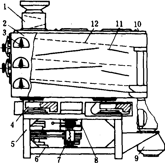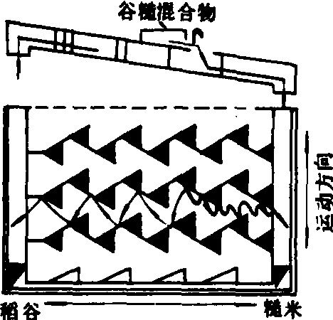 图1 长方形选糙平转筛 1.进料斗; 2.筛体; 3.筛面角度调节机构; 4.偏心回转机构; 5.机架; 6.减速箱; 7.调速机构; 8.电动机;9.出料斗; 10.筛盖; 11.筛面; 12.分流板 谷糙分离机 与谷糙分离筛的主要区别在于不用筛面,而用粗糙面或其他形式的分离部件。谷糙分离机的种类很多,国际上使用较广泛的有巴基谷糙分离机(简称巴基机)、袋孔式振动谷糙分离机和重力谷糙分离机等。它们的特点是谷糙分离效率高,对原粮的适应性强,即使稻谷品种混杂,粒度不齐,对谷糙分离效率的影响仍然较小。 巴基机的分离原理如图2所示。它是利用稻谷和糙米表面摩擦系数、比重和弹性等物理性质的差异进行分选。谷糙混合物从进料机构落入装有三角形挡板分离台的分选曲槽中,由于分离台作往复运动,谷糙混合物受惯性作用而左右摆动。在运动中,混合物产生自动分级,稻谷上浮、糙米下沉,与曲槽凸出的三角形挡板发生撞击作用,因稻谷的弹性较强,又浮于上层,与三角形挡板产生较大的撞击力,使稻谷向分离台上方移动。糙米集聚在分离台曲槽底部,因其弹性较差,表面光滑,不能与三角形挡板连续撞击,而顺着分离台下方滑动,使谷糙得到分离。