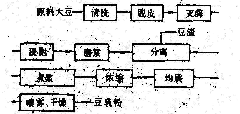 | 释义 | 豆乳粉加工soybean milk powder processing将豆乳液进行浓缩、均质、喷雾干燥等处理制成粉状速溶饮料的过程。豆乳粉又称干燥豆乳或抽出蛋白及豆浆粉,是一种粉状的速溶饮料。豆乳粉的基本生产工艺流程见图1。